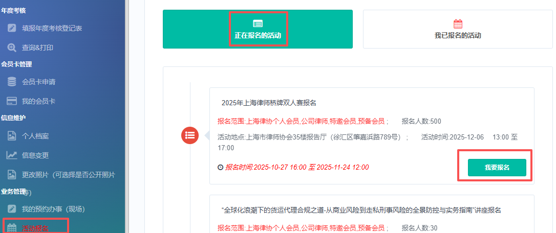 通過個人會員賬號登錄東方律師網,進入“會員中心”,點擊“活動報名”,如下圖所示: