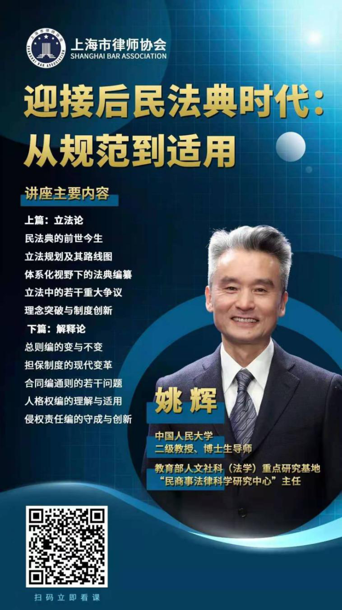 2021年1月31日,上海律協律師學院聯合民事業務研究委員會在上海市錦天城律師事務所舉辦“迎接后民法典時代:從規范到適用”專題線上直播講座。本次講座由中國人民大學法學院博士生導師姚輝教授主講,上海律協民事業務研究委員會主任施克強律師主持,上海市錦天城律師事務所主任顧功耘主任致辭。