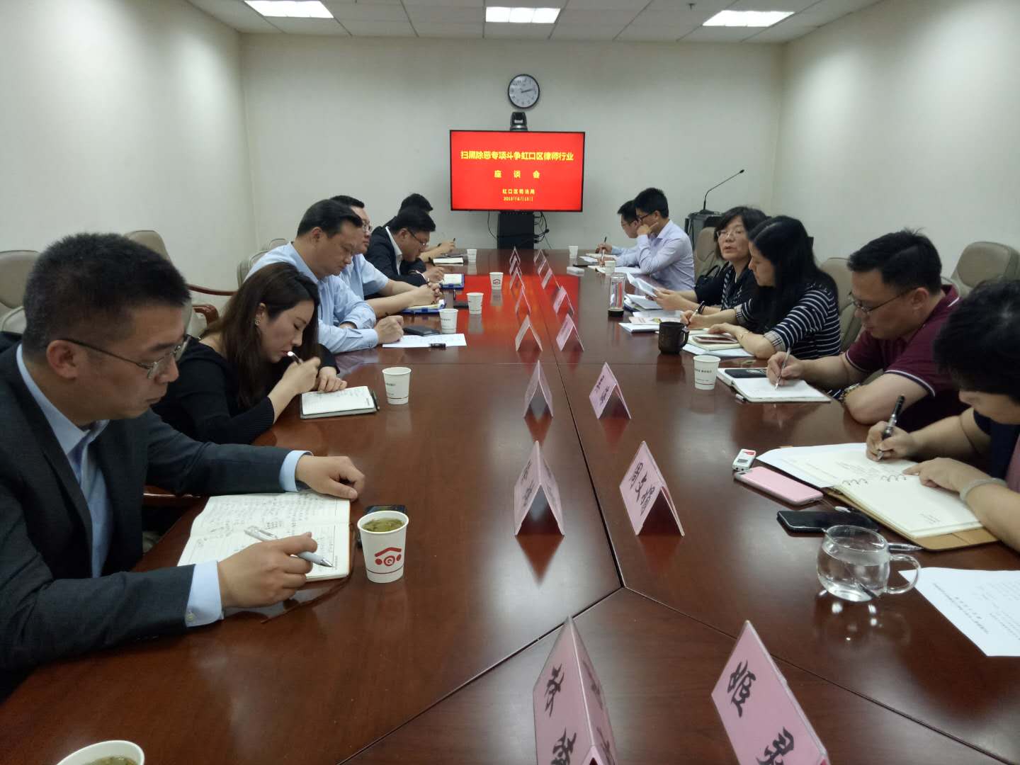 2019年6月13日下午,虹口區司法局召開掃黑除惡專項斗爭虹口區律師行業座談會。區司法局副局長、區律師行業黨委書記胡曉紅、區司法局律公科科長周俊以及部分律師代表參加了會議。