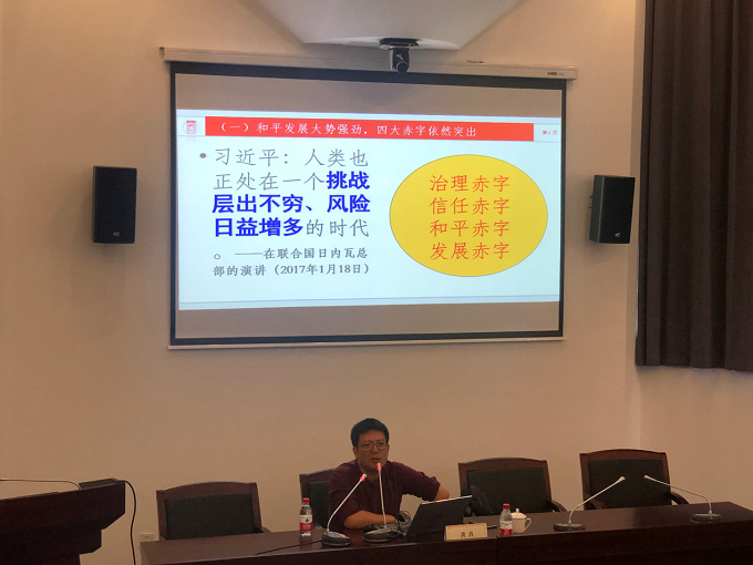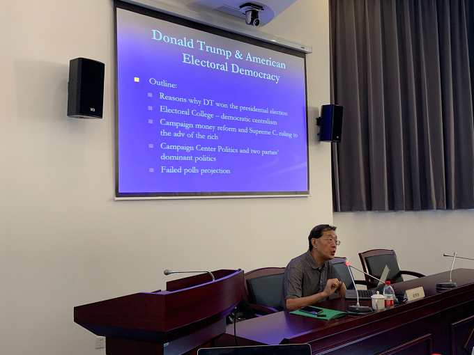 上午第一位分享的嘉賓是上合組織基地的訪問學者霍世濤教授,霍教授全程英文授課,講座的主題為“Donald Trump & American Electoral Democracy”。霍教授介紹了美國的選舉人制度(Electoral College),分析了川普當選美國總統的背景情況及各類偶然及必然因素,以此幫助學員更好地理解當今中美關系。在講座的過程中,學員就講座中提到的問題與霍教授進行積極互動,氣氛熱烈。