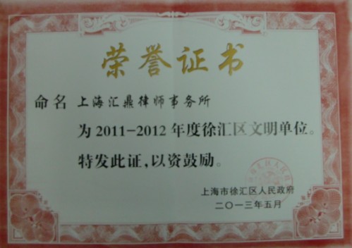 經過多次考核,5月20日,徐匯區人民政府命名匯鼎律師事務所為2011-2012年度徐匯區文明單位。